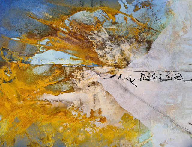 Leuchtendes Rostorange trifft auf Gold und Schrift. Experimentieren Sie mir verschiedenen Techniken und Materialien. Acrylfarben als Grundlage um dann mit Spachtelmasse zu arbeiten. Ein Hauch von Eisenspänen, die von Rostorange bis ins Türkis gehen, das ist abhängig von den Materialien. Die Schrift als zusätzliches Element, es können auch Seiten aus Büchern oder Zeitschriften sein, ob leserlich oder nicht, das bleibt Ihnen überlassen. Vorkenntnisse sind nicht nötig.