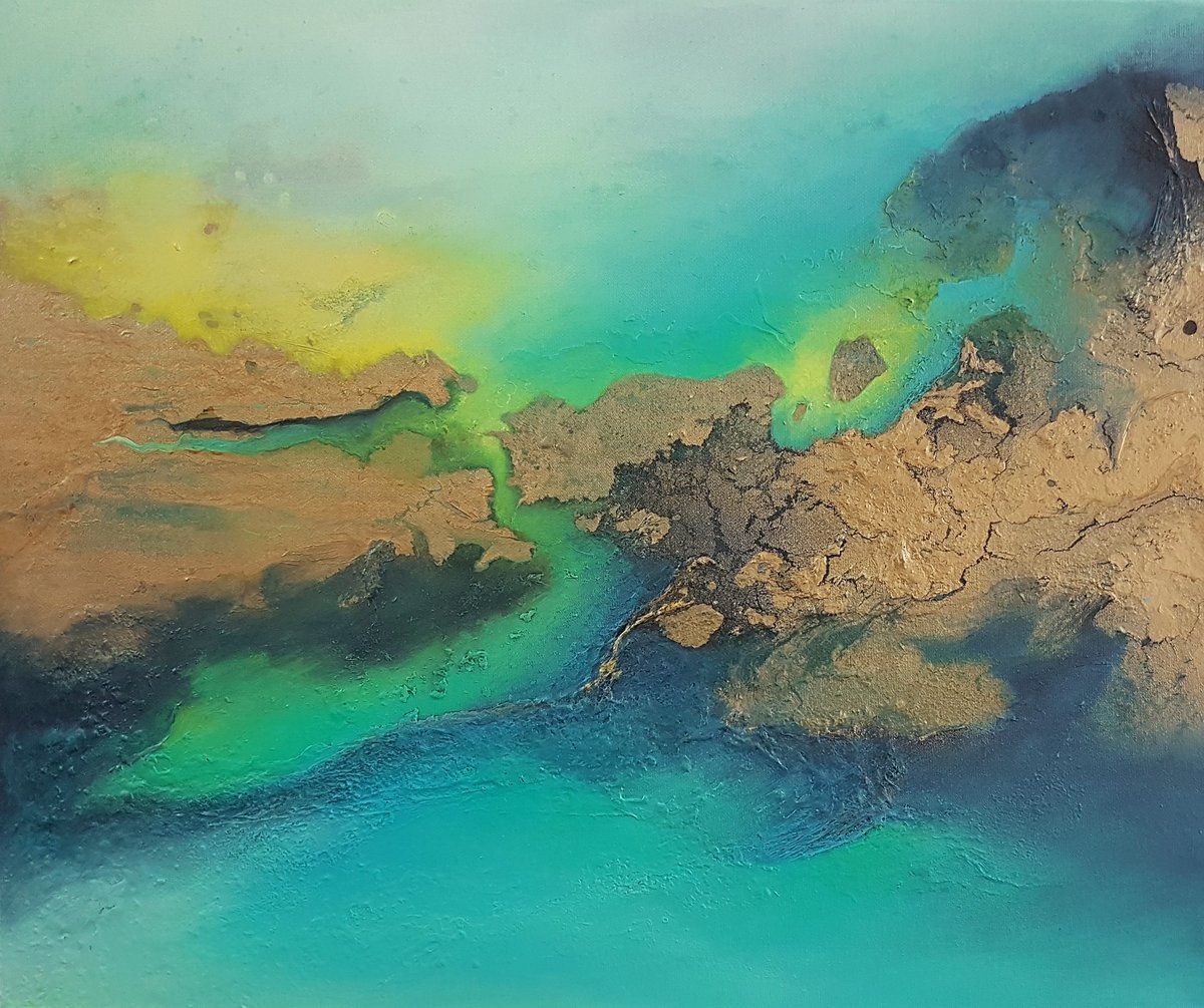Hier entstehen Bilder, die an fantastische Welten und an geheimnisvolle Landschaften erinnern. Das Bild entwickelt sich von einem transparenten Hintergrund in etwas völlig anderes mit Tiefe und Fantasie. Acrylfarben werden „geschüttet“, trocknen und dann weiterbearbeitet. Besondere Effekte entstehen durch die Verwendung von Schelllack und Goldspray. Gold als verbindendes Element für leuchtende Farben und dunkle Farben als Kontrast. Lassen Sie sich überraschen!